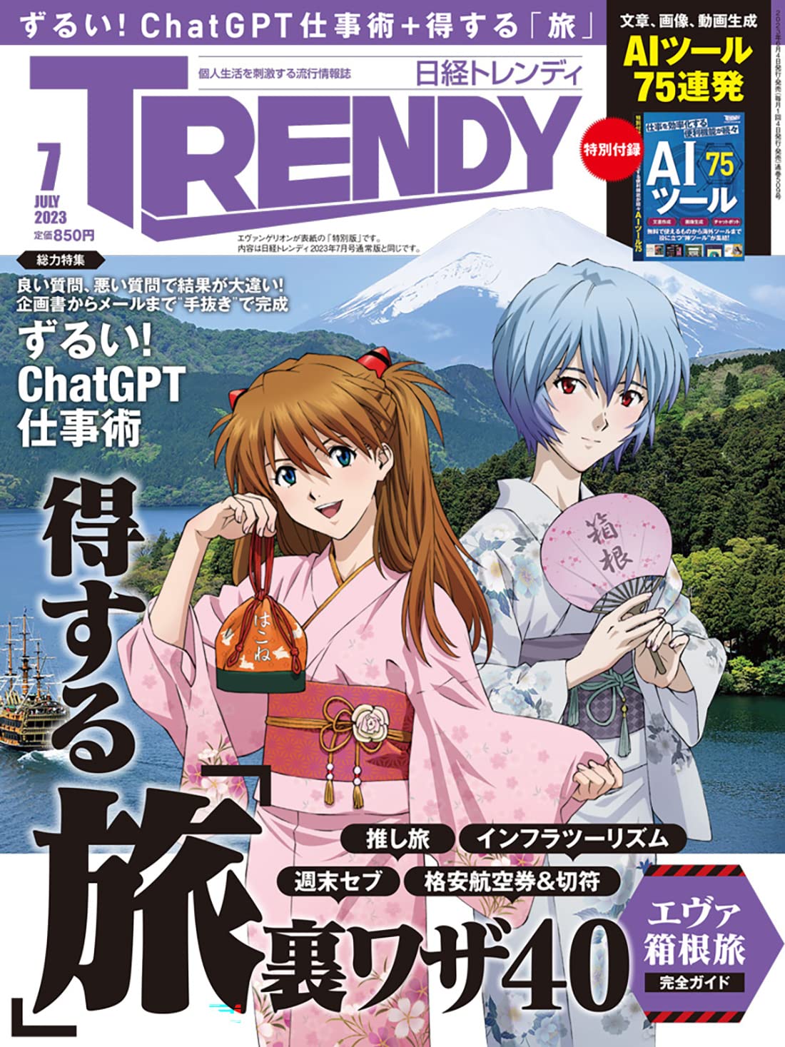 日経トレンディ2023年7月号の「chatGPT特集」と「エヴァンゲリオン推し旅」内容を教えてください。(Google Birdに質問)